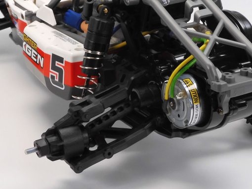 Fjæringssystemet består av uavhengige doble bærearmer med CVA oljedempere, og styringen er forbedret med en 3-delt styrestag for realistisk kontroll. Skrensvinkelen på 22,5° foran gir deg en perfekt balanse mellom kontroll og kraft.