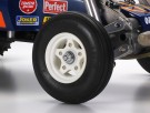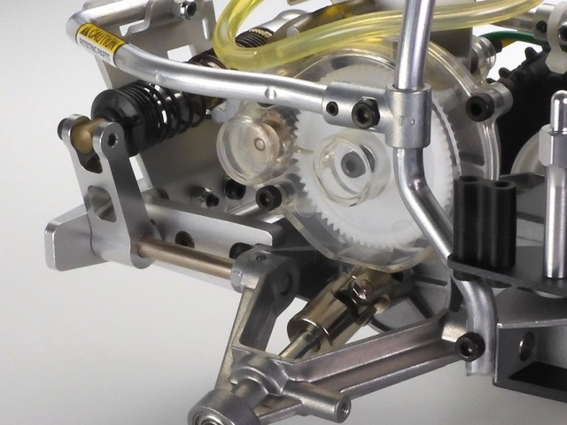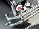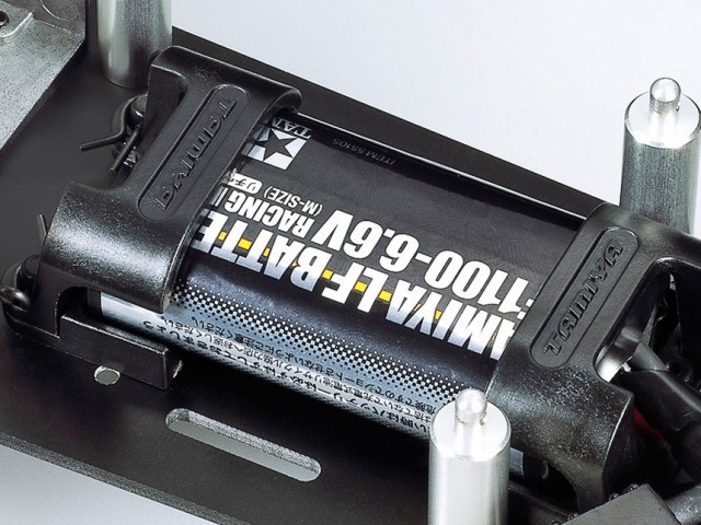 A Highly Satisfying Off-Road Experience The original 2mm-thick FRP and duralumin chassis plate is replaced with a new 2.5mm-thick FRP plate, finished in black like the 1.5mm-thick mechanism deck. The model can be powered by the separately sold Tamiya LF Battery LF1100-6.6V Racing Pack (M-Size), which will fit neatly underneath the mechanism deck. Afficionados of the original model will note that the die cast arms remain the same on the 2014 version, while the separate reserve tank is still used on the rear suspension, which otherwise receives a number of new parts. A sealed direct drive gear case also houses the motor and protects it from dust and dirt. Stability is provided by ribbed front tires, and the rear gives excellent grip thanks to tires with tread patterns that extend to the sidewalls. 3-piece wheels are used both front and rear. |
