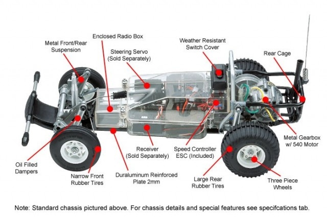 Chassiset har en 2 mm tykk FRP-plate med en forsterkende aluminiumsplate for styrke og fleksibilitet for å sikre stabilitet. 4-hjuls uavhengig fjæring, den har dobbel bærearms oppheng foran og bak har den svingakseloppsett, støpte fjæringsarmer og oljedempere. Elektronikk og batteri er beskyttet av en slitesterk boks i gjennomsiktig robust plast. Den leveres utstyrt med kulelager rundt hele bilen for å redusere friksjonstap, Bilen har også 3-delte felger og leveres mede sporede dekk foran og ribbede dekk bak som sikrer suveren terrengytelse.