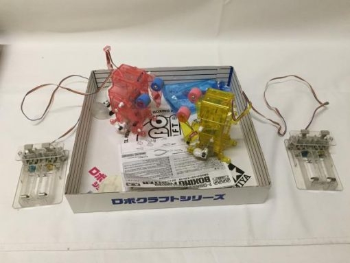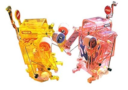 The Boxing Fighter now comes as a set of 2. The boxing fighter features a twin motor gear box enabling this little boxer to punch while moving backwards, forwards or turning to the left or right. The Boxing Fighter is also equipped with a judging plate that will allow you to decide who the winner of the fight is. The plate will lower each time you hit your opponent’s mouth. When your opponent’s plate is completely lowered, you win the fight. You can also adjust the level of each fighter, making it easier or harder for your fighter to be knocked down by fitting one or two stays to the bottom rear of the fighter. Assembly is very simple with use of screws and snap-lock parts. Packaging specially designed to be used as a ring, with a boxing ring printed on the inside.