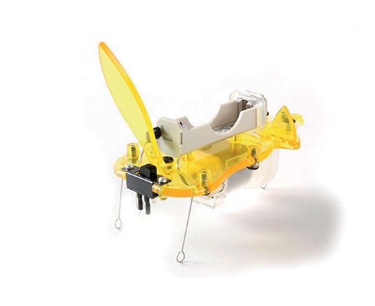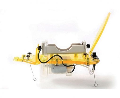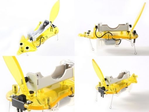 Internal motor spins a cylindrical plate with a weight (a screw) placed on one side creating an updown rapid vibrating movement. This vibration is then conveyed to 3 rods that smoothly propel the model forward in a sliding type movement.