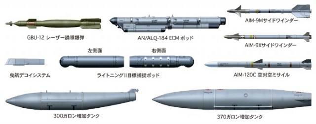 Extensive weapons set features AIM-9L/M and AIM-9X sidewinders, AIM-120 AMRAAM, wing and centerline fuel tanks, and LITENING II targeting pod.