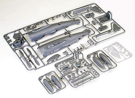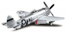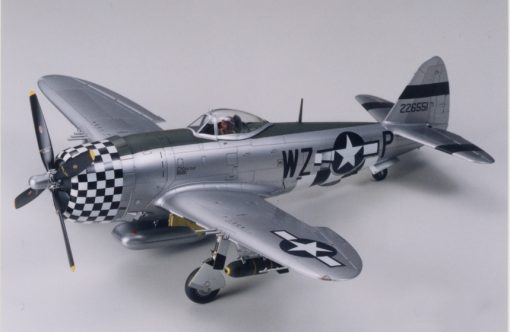 Republic P-47D Thunderbolt “Bubbletop” plastic assembly kit. 1/48 scale, Overall length: 230mm, Overall width: 259mm. This is the representation of P-47D late production that was nicknamed “Bubbletop”. The massive form of the plane, especially its belly and its cowling, has been accurately reproduced. Flaps come as separate parts and can be attached in the up or down position. Parts for replication of 3 types of mirrors, gun sights and 4 types of propellers are provided. Engine cowling flaps and the intercooler air outlets on each side of the fuselage can be represented in the opened or closed position. Parts for replication of 500-pound bombs, rocket launchers and 3 types of drop tanks are part of the kit. A pilot figure and decals for two different markings are included.