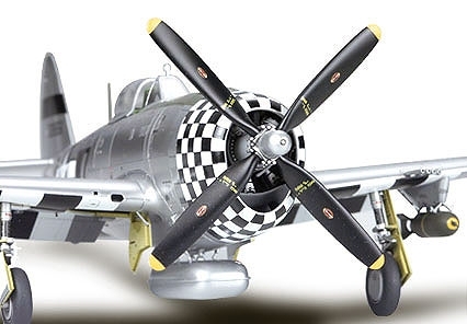 In May 1941, as the war raged in Europe, a single-engine fighter of more than 4t made its first flight. This fighter was the XP-47B, prototype of the Republic P-47 Thunderbolt of which a total of 15683 units will be built. Thanks to war experience, this aircraft was equipped with a 2000hp radial R-2800 engine, a supercharger and eight 12,7mm machine-guns. The XP-47B was to reach 633km/h and in January 1942, just after the USA went to war, the production of P-47B began. It was followed by the P-47C that incorporated various improvements and, from April 1943, by the P-47D, the most built version. The P-47D was equipped with an R-2800-59 engine, which can develop up to 2300hp with combat emergency water injection system engaged. The ducts that were passing on the sides and below the cockpit to connect the supercharger placed behind the pilot’s seat gave to this plane its massive aspect. Many sub-types of the P-47D, designated D-1 to D-40, were produced but the first versions were called “Razorback” because of their sharp edge dorsal fin. The D-25 sub-type, which was introduced around June 1944, was fitted with an electrically actuated bubble canopy in order to improve pilot visibility and increased capacity fuel tanks. This decision resulted in a completely remodeled plane shape. All subsequent sub-types were also fitted with the bubble canopy and became a characteristic feature of late production Thunderbolts. The P-47 “Bubbletop” proved to be an excellent, well-balanced fighter-bomber.