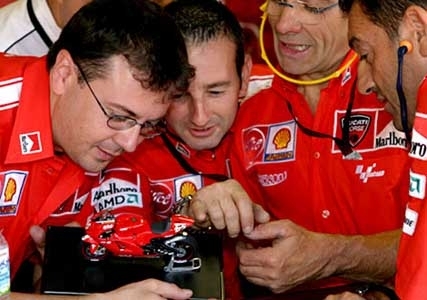 Desmosedici is a compound word made from the Italian for sixteen, "sedici" and the name of Ducati's trademark desmodromic valve design. The DOHC 16 V4 engine is composed of two 90 degree L twin components held together in a tubular steel truss-frame, with swing arm and rear shock pivots directly attached to engine in a truly original fashion. The sleek and powerful bike was piloted in its debut 2003 MotoGP season by L. Capirossi, former 125 and 250cc class title holder, and World Superbike Champion T. Bayliss. The GP4 really showed its stuff during its 2003 debut season, taking 3rd place at Suzuka and winning 1st at Catalunya. Maintaining the same basic structure in 2004, Ducati brushed up everything from the engine to the body to make an even higher performance superbike. While the Desmosedici GP4 had a difficult first half of the season, it began to show results towards the end, with L. Capirossi winning 3rd place in round 15. T. Bayliss also took 3rd in the final round, ending Ducati's season on a high-note, and promising further excitement still to come!