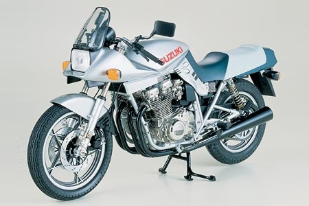One of the most famous motorcycle shows in the world, is held every two years in Cologne West Germany, and the 1980 show is sure to stand out as one of the most unforgettable. One reason was that Honda released their CX500 turbo for the first time, and the second is that Suzuki”s GSX1100S “Katana” (Japanese for sword) was unveiled. The Honda CX500 attracted attention for its advanced engine techniques and the Katana for its advanced and aggressive body styling, which broke from common traditional motorcycle styling. Although the Katana GSX1100S styling impressed the many thousands of viewers, almost everybody thought that it was just for show and the production model would be quite different. During the summer of 1981, Suzuki released the production Katana with almost exactly the same body styling seen at the Cologne show, with subtle improvements in the engine and running gear. The body styling is from the genius of Mr. Hans A. Muth of West Germany, who spent much time ensuring driver comfort in his design, and which proved out in many wind tunnel tests. The entire styling was derived from research on the best drivers position, and the rearward placed backsteps and unique tank styling were not done just for the pleasing jet age appearance. Large capacity fuel tank and small fairing were blended together for the best airflow around the rider and the bike. Although the bike is most noticable for its styling, every part in it is quality. Engine is an air-cooled, parallel 4 of 1075cc, using 16 valves. With the unique Suzuki TSCC (Twin Swirl Combustion Chamber) in the engine, it puts out 111 hp. This tremendous power transmits into a road speed of 230 k/h and its unique body styling deeps it stable even at these high speeds. Suzuki is shipping a 1000cc Katana GSX1000S tot he American market, and also a 750cc version to the European market as well. Requests from Japanese enthusiasts prompted Suzuki to also market a 750cc Katana GSX750S to their market.
