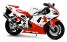 At the Motorcycle Show held in Milan, Italy, in September of 1997, the Yamaha YZF-R1 supersport motorcycle made its debut. Sporting a powerful 1000cc engine, it has the compact construction of a 400cc bike. The YZF-R1 was developed for maximum possible cornering ability in a production motorcycle. With a 1000cc water-cooled, four stroke, 4-cylinder, 5-valve engine and adopting a redesigned EXUP exhaust system, it pumps out 150hp of high-intensity power. Subtle throttle control makes both superb acceleration response and rhythmic cornering a reality. The Deltabox II aluminum frame was sought after not only for its rigidity, but more so for its moderate flexibility during tight cornering. With the addition of a long span aluminum swing arm, high control ability has been achieved. By adopting an upside-down front fork, stroke distance has been increased and traction heightened. Boasting a sharp form with multi-reflector lights, the YZF-R1 has been given an unprecedented style. From the contact points between the rider and motorcycle, right down to the material used in the seat and tank, the YZF-R1 has been thoroughly studied. Of course, the abundance of high precision and high quality parts goes without saying. Designed to cruise at high speeds on winding roads, the YZF-R1 shatters expectations about large exhaust engine motorcycles. Yamaha has expanded the possibilities of a 1000cc bike.
