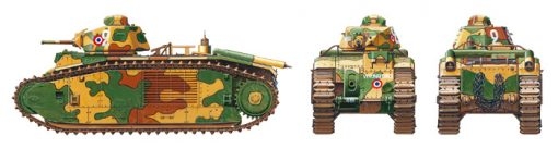 Defender of the Republic In May 1940, B1 bis tanks stood in the way of German armies determined to strike a crushing blow against France on her own soil. Introduced as an upgraded version of the original Char B1, which was developed in the nineteen twenties, the B1 bis entered production in 1937. The rivet-joined hull mounted a short-barreled 75mm howitzer, while a small, one-man turret carried a longer-barreled 47mm tank gun. The B1 bis was one of the most heavily armored tanks of its time, with plating that was 60mm thick in places, amply capable of defending against anti-tank fire such as that from 37mm PAK guns. The B1 bis could more than hold its own against individual German tanks, and was greatly feared by enemy soldiers who encountered it. |