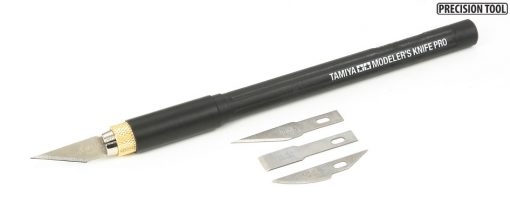 Knivens kropp har et elastomergrep og en metallchuck for å feste bladet sikkert. Beskyttelseshette for kniven og et plastetui til reserveblader følger også med.